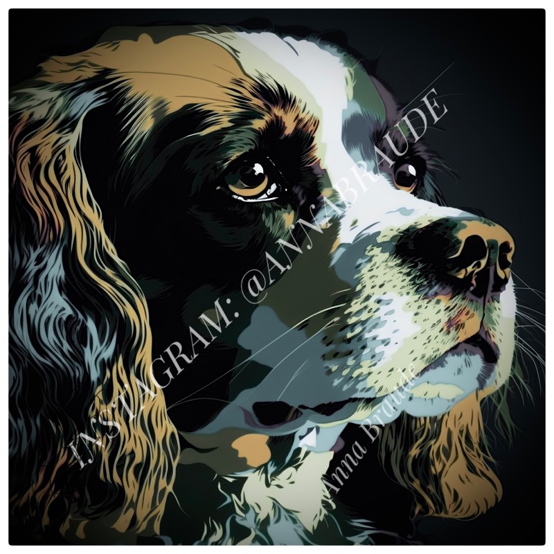 Presented here is the digital painting of a charming Cavalier King Charles Spaniel dog portrait, evocative of the purest and most innocent joys of life.