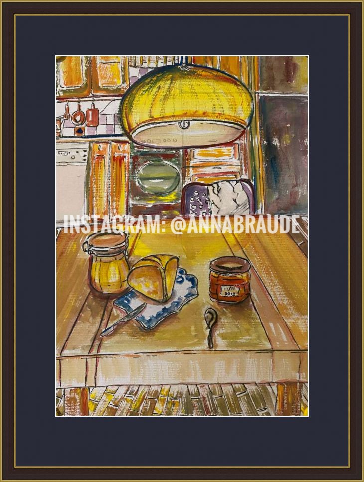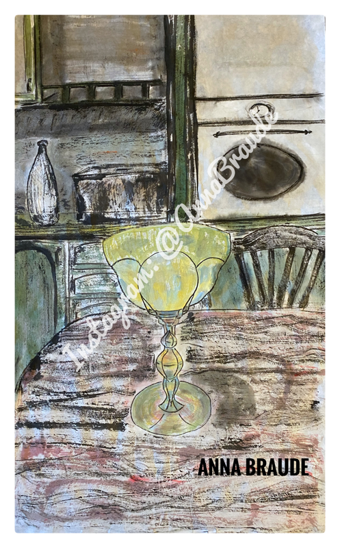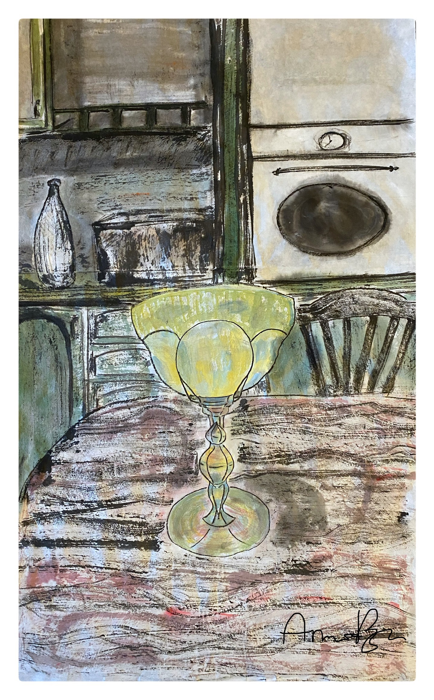 takes me back to cozy evenings in the kitchen! The art is depicting a beautiful scene of a glass on the table in a warm and inviting kitchen atmosphere.